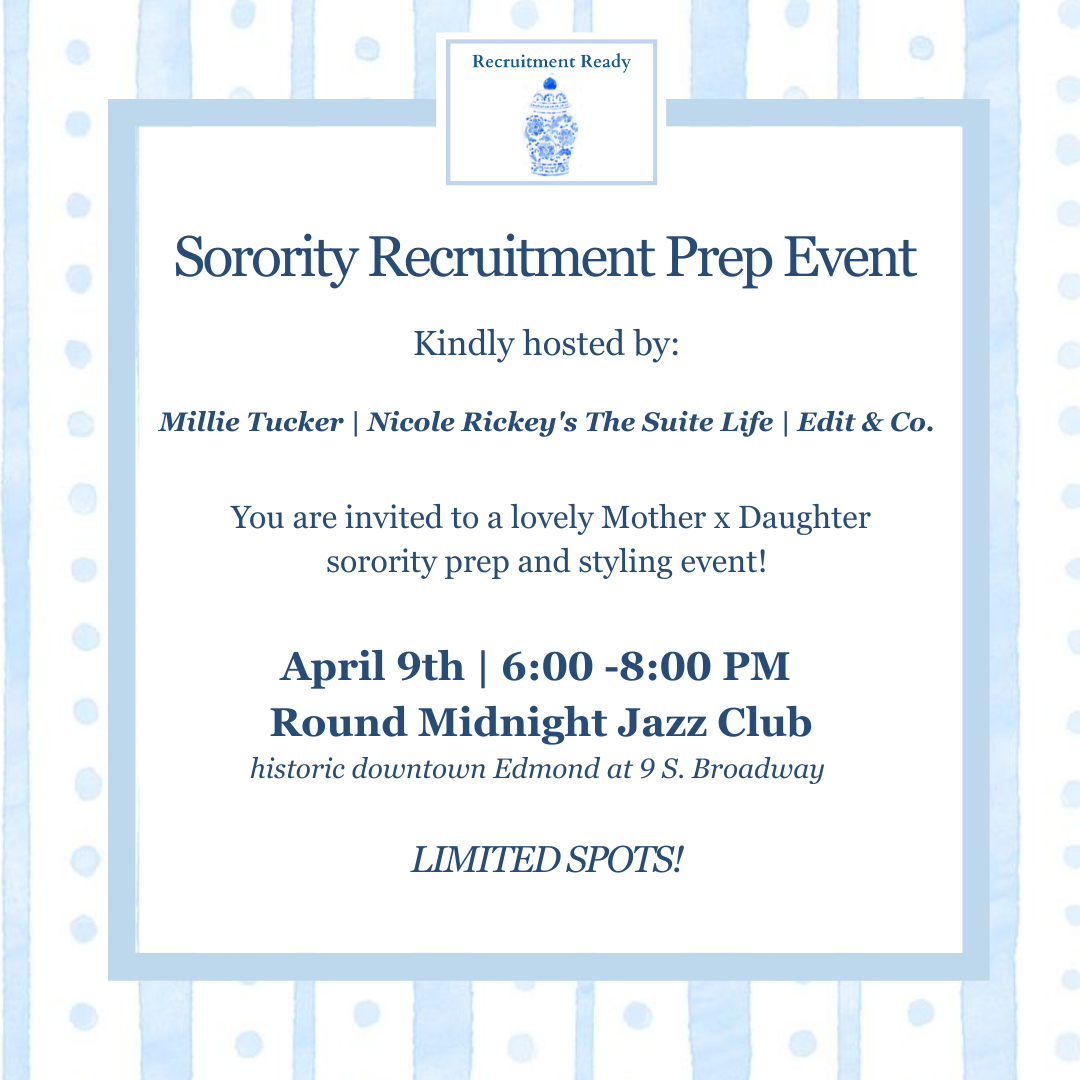 Emily of Recruitment Ready will be sharing insider strategies, what to expect during each round, and the confidence-boosting tips every PNMs need to walk into recruitment feeling prepared and polished. Enjoy light bites and sips and make memories with friends!